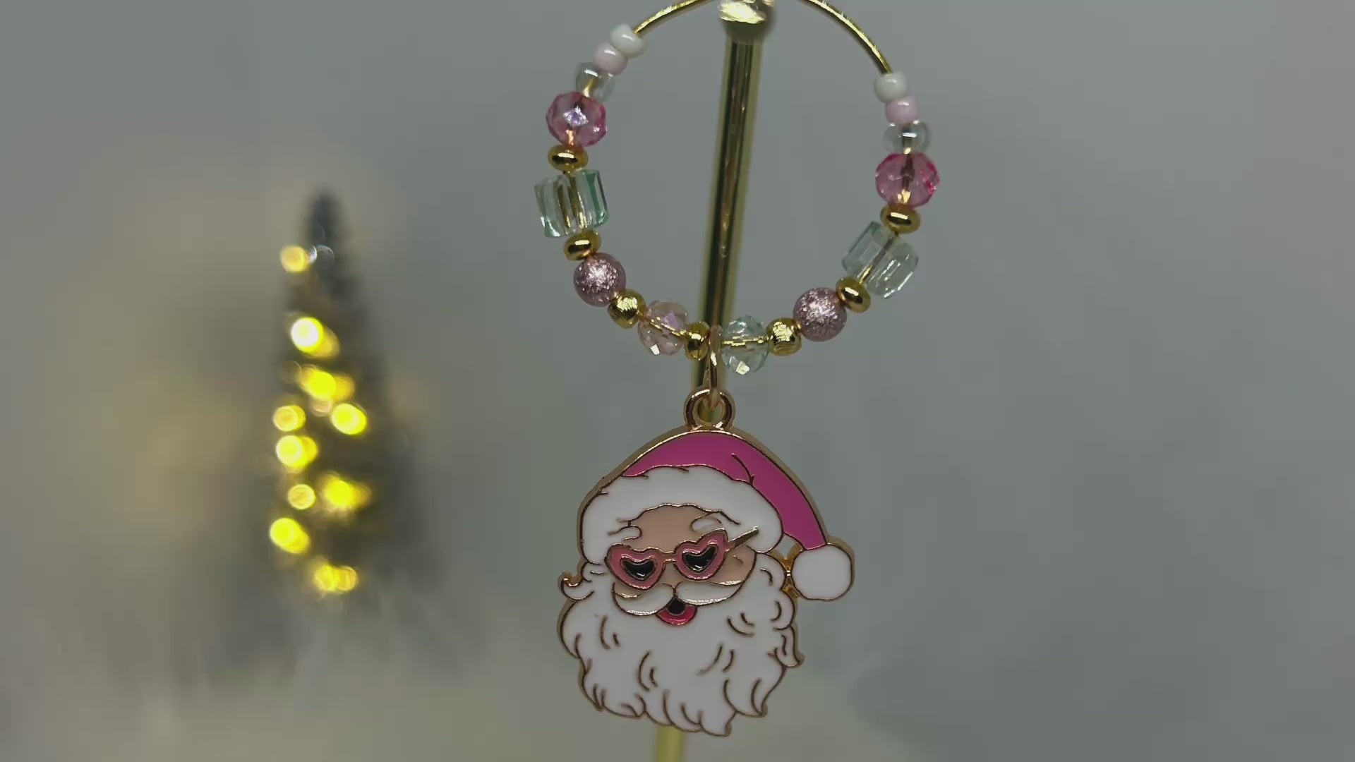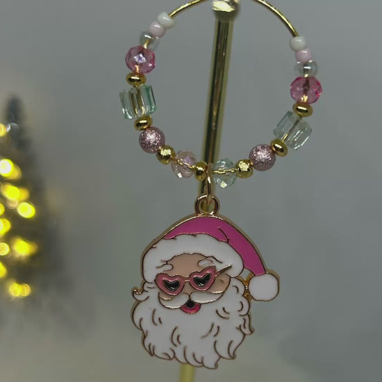 Pink and mint green glass and metal wine glass charms featuring high-quality beads in an elegant design. One silver hoop showcases a dazzling pink gemstone, while the gold hoop features a charming Santa wearing heart-shaped glasses.