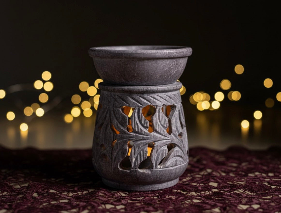 - 1 Handcrafted Soapstone Oil Burner (3.5") - Natural soapstone with intricate cutout pattern. Holds a splash of essential oil with 1/4 cup water, tea light underneath. Premium quality soapstone with a smooth tactile finish – a work of art!