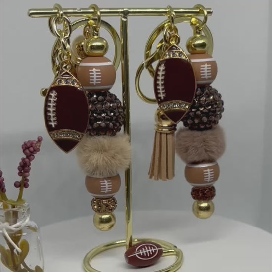Elevate your football style with this stunning handcrafted keychain that sparkles as bright as your team spirit. Each piece features a luxurious football charm adorned with shimmering rhinestones, complemented by glittering beads and a soft, delicate pom-pom accent + tassel.