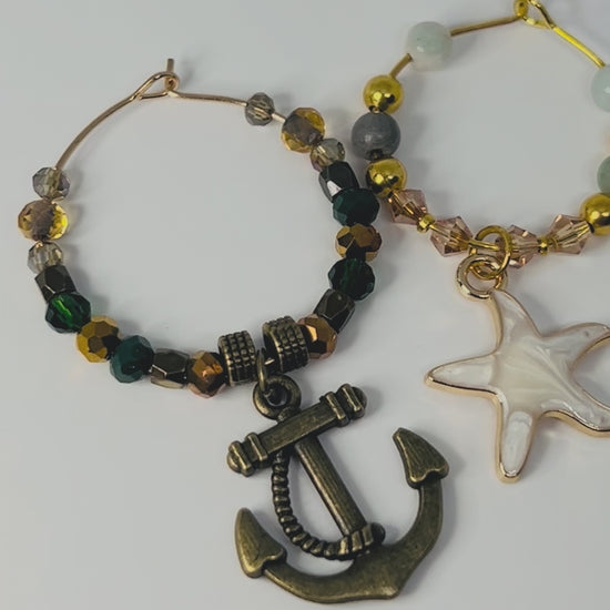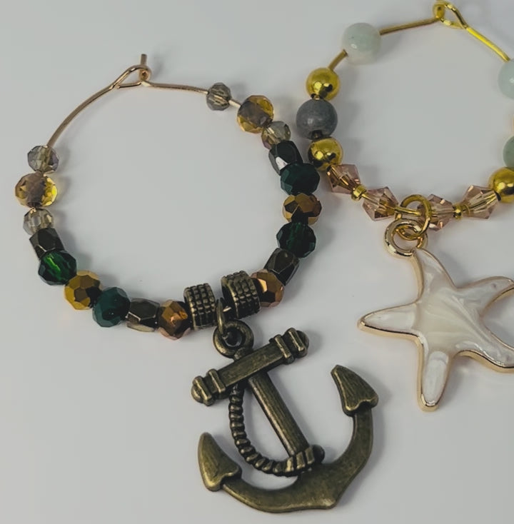 Set includes: 2 wine glass charms (1 anchor, 1 starfish) and bonus hypoallergenic earrings for her.