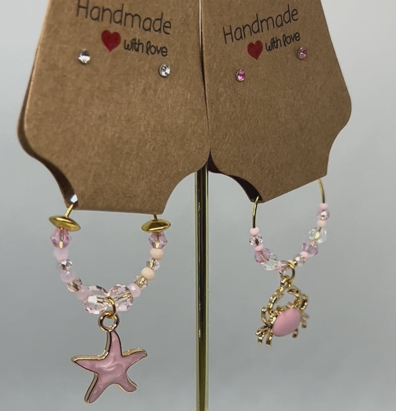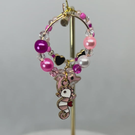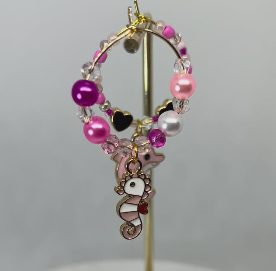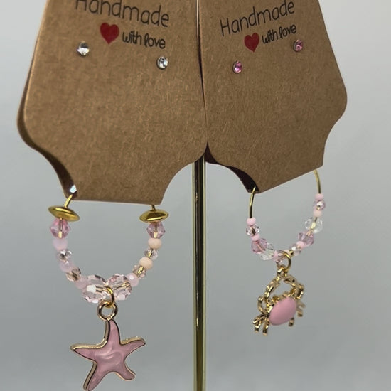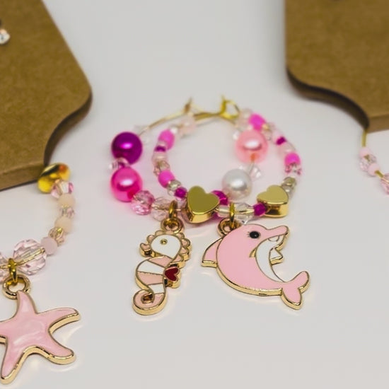 Bring the magic of pink sands and ocean waves to your next gathering with this stunning 4-piece wine glass charm set! Each charm features gorgeous pale pink, hot pink, and multicolored glass beads - some with a beautiful pearly tone - and adorable ocean friends: a playful dolphin, graceful seahorse (adorned with a red heart), charming crab, and delicate starfish.