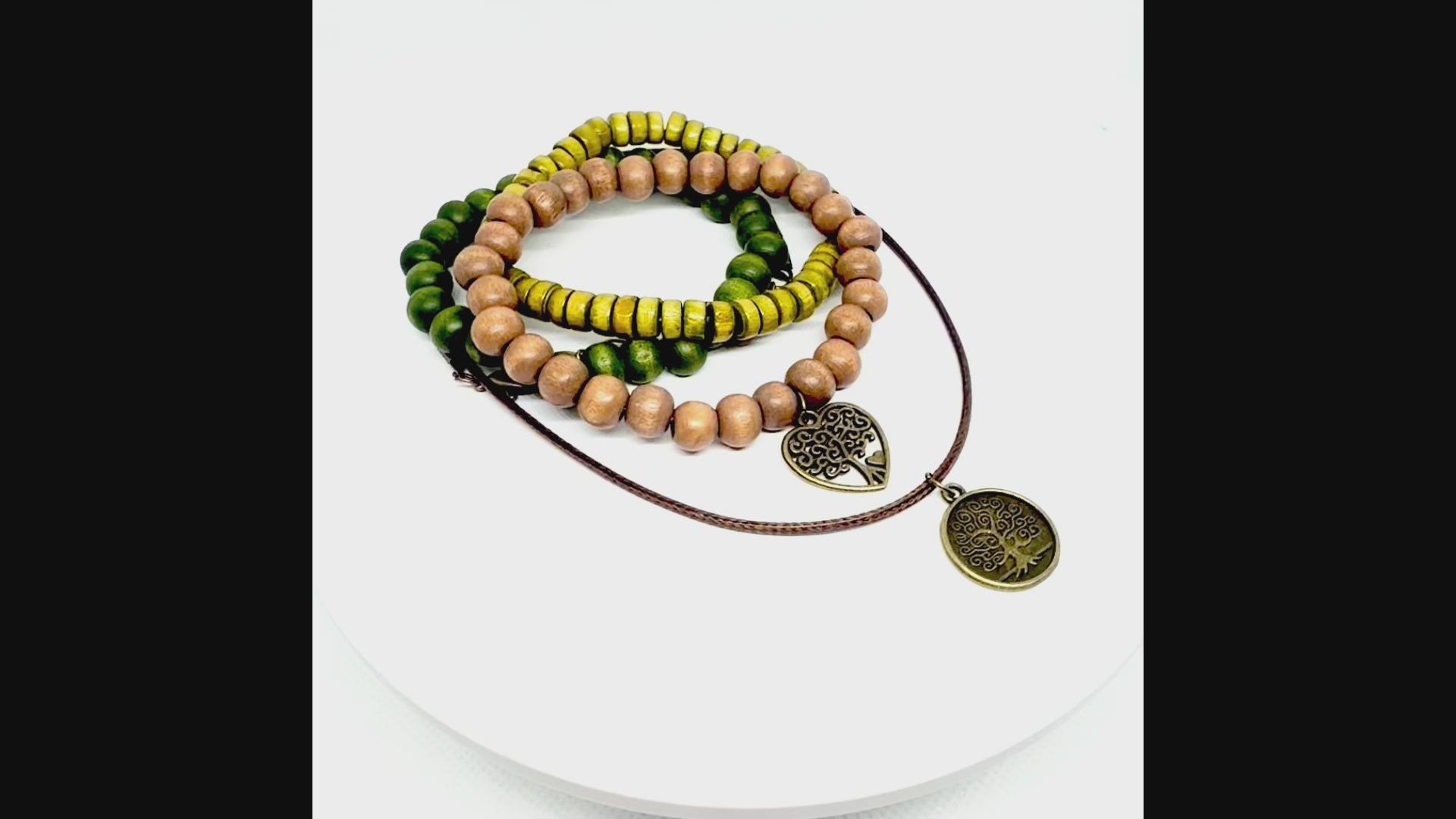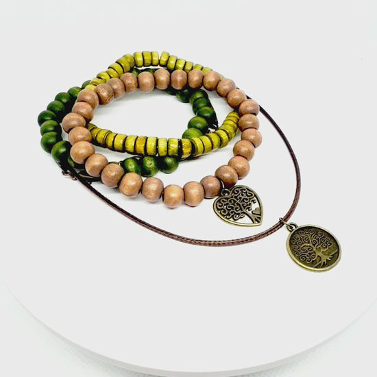 The suite features a curated stack of three stretch bracelets, combining wooden beads and vibrant green accents for a comfortable, layered look. A delicate antique bronze heart-shaped charm, etched with the Tree of Life, serves as a beautiful reminder of growth and connection. This theme carries through to the matching circular pendant, which hangs from a supple brown vegan leather adjustable cord for a perfectly customized fit.