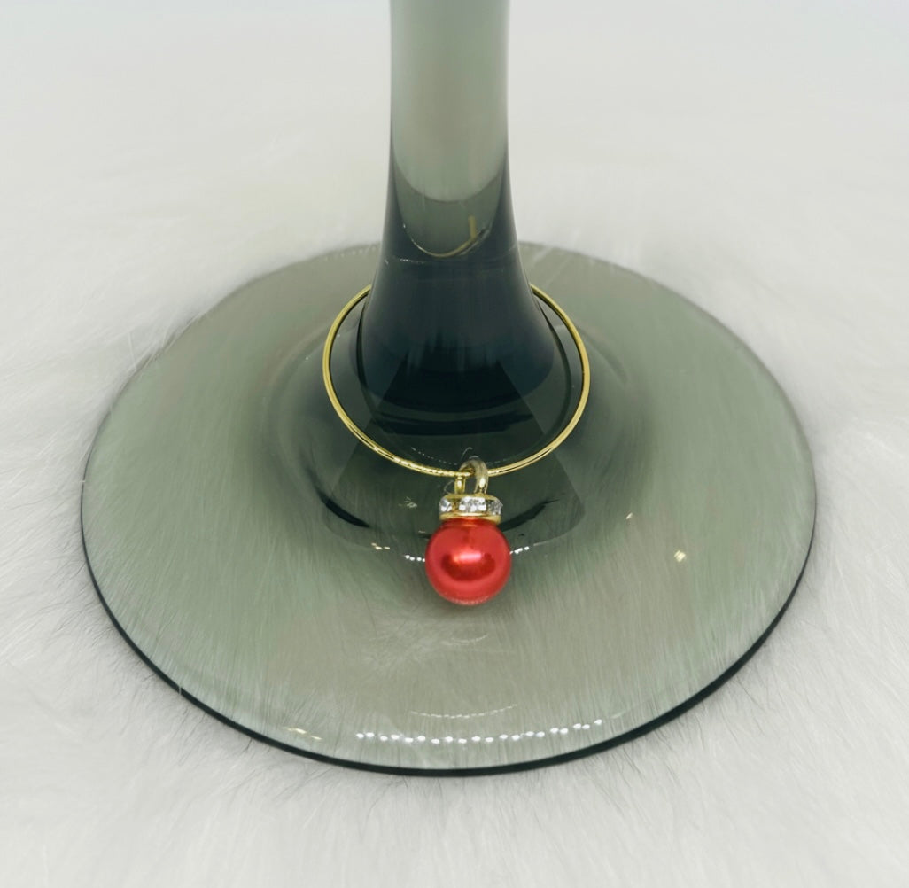 Add a touch of elegance to your holiday gatherings with this beautiful set of 4 handmade wine glass charms! Each charm features a lustrous pearlescent bead in gorgeous colors accented with sparkling rhinestones and gold wire hoops.